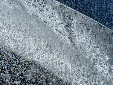 Temperature dictates how clear the ice is; cracks portray a passage of time when the cold settled in and the water molecules expanded; and hidden underwater springs betray themselves appearing on the frozen surface like nerve cells and gangly sea creatures.